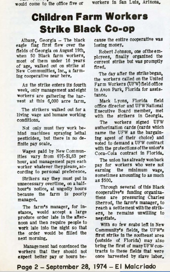 Wilkins writes, from his personal experience, of exploitation by the Sherrods of black workers -- and not just black workers but black child laborers in the 1970s, and corroborates this by including a link to a PDF from a United Farm Workers newspaper from 1974. His link doesn't go to the exact paper, so I've picked up the permalink. Scroll down to the Children Farm Workers Strike Black Co-op on left (on page 2). Here's a screen shot I took of it.