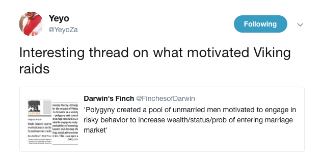 Lehman nails the reason why polygamy is a terrible idea. Men who have no mating prospects tend to see life as not worth living, so why not engage in thrill-seeking behavior? Some of that may be beneficial, but a lot of it is harmful, both to the person doing it and to society in general. A time-honored method of getting rid of those surplus men is to send them off to war. Many of them will go willingly, as thrill-seeking, hoping to return with war treasure, or just as a means of getting their life over with.