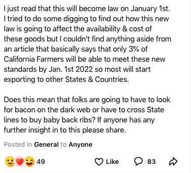 This was comment #83 on NextDoor -- mine -- after 82 previous comments from a bunch of smugs thrilled to bits about this law; many vegan and happy there might be less meat-eating (and never mind how that might play out):