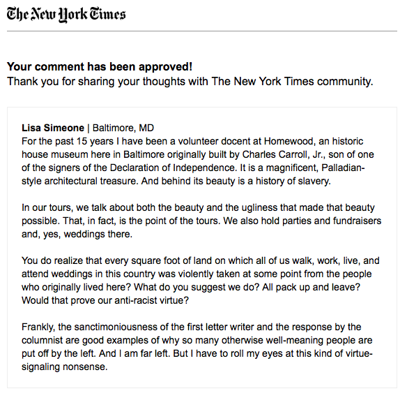 Subject: Fw: Your Comment on I'm Invited to a Destination Wedding at a Plantation. What Do I Do?Amy, thought you would appreciate. I'm getting slaughtered by the wokerati in the comments section -- ha ha! (Of course I have the guts to write under my own name, unlike all these virtue-signaling wankers excoriating me, most of them erecting straw man arguments and putting words in my mouth, to boot.)