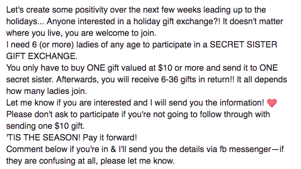Well, there's an article in the LA Times noting that the "holiday gift exchange" Facebook post is "technically an illegal scam." Here's a version of that: ![]()