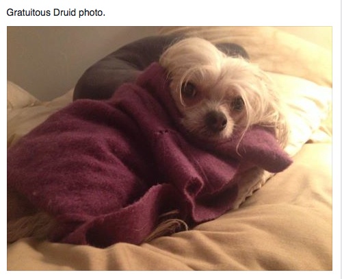 Wow! It must be cold if a dog is letting you wrap her up in a blanket.