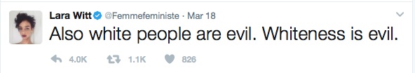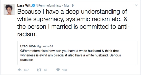 She has a white husband. That must be fun. (See the lower of the two tweets in this screenshot first.)