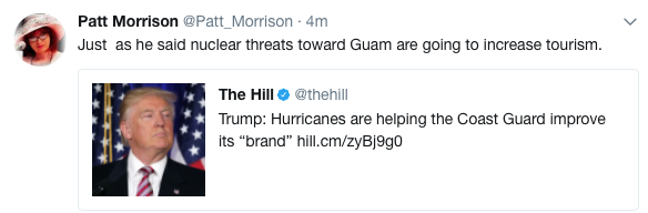 Not exactly Trump's words. I think what he said was the Coast Guard's performance in response to the hurricanes greatly improved its brand. Only a woman or a Democrat would think there was something wrong with that comment praising the Coast Guard's impressive courage and competence.
