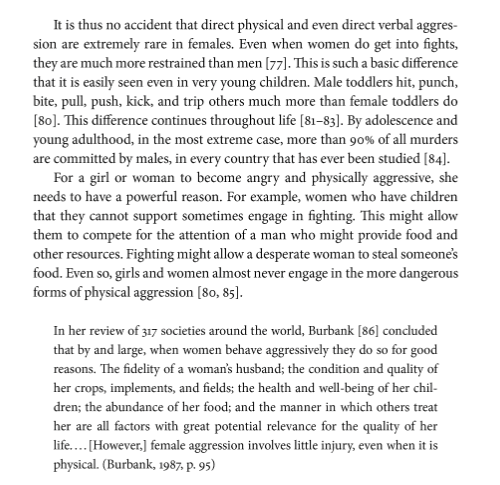 However, physical violence is an uncommon approach for women, as researcher Joyce Benenson points out in her excellent book on sex differences in psychology and behavior "Warriors and Worriers." Here's a bit: ![]()