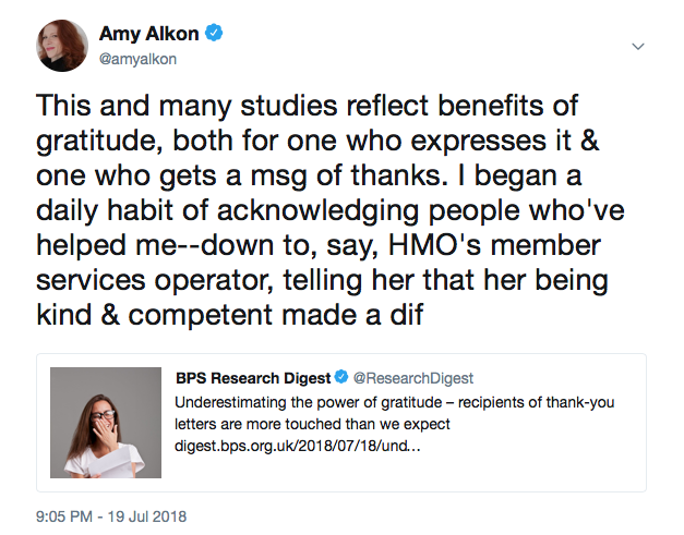 A study on the power of gratitude (in the form of thank you letters) that Christian Jarrett posted on BPS Research Digest reminded me of the many studies I've read on the benefits of gratitude -- and how they've changed the way I interact with people: both strangers and people I'm close to.