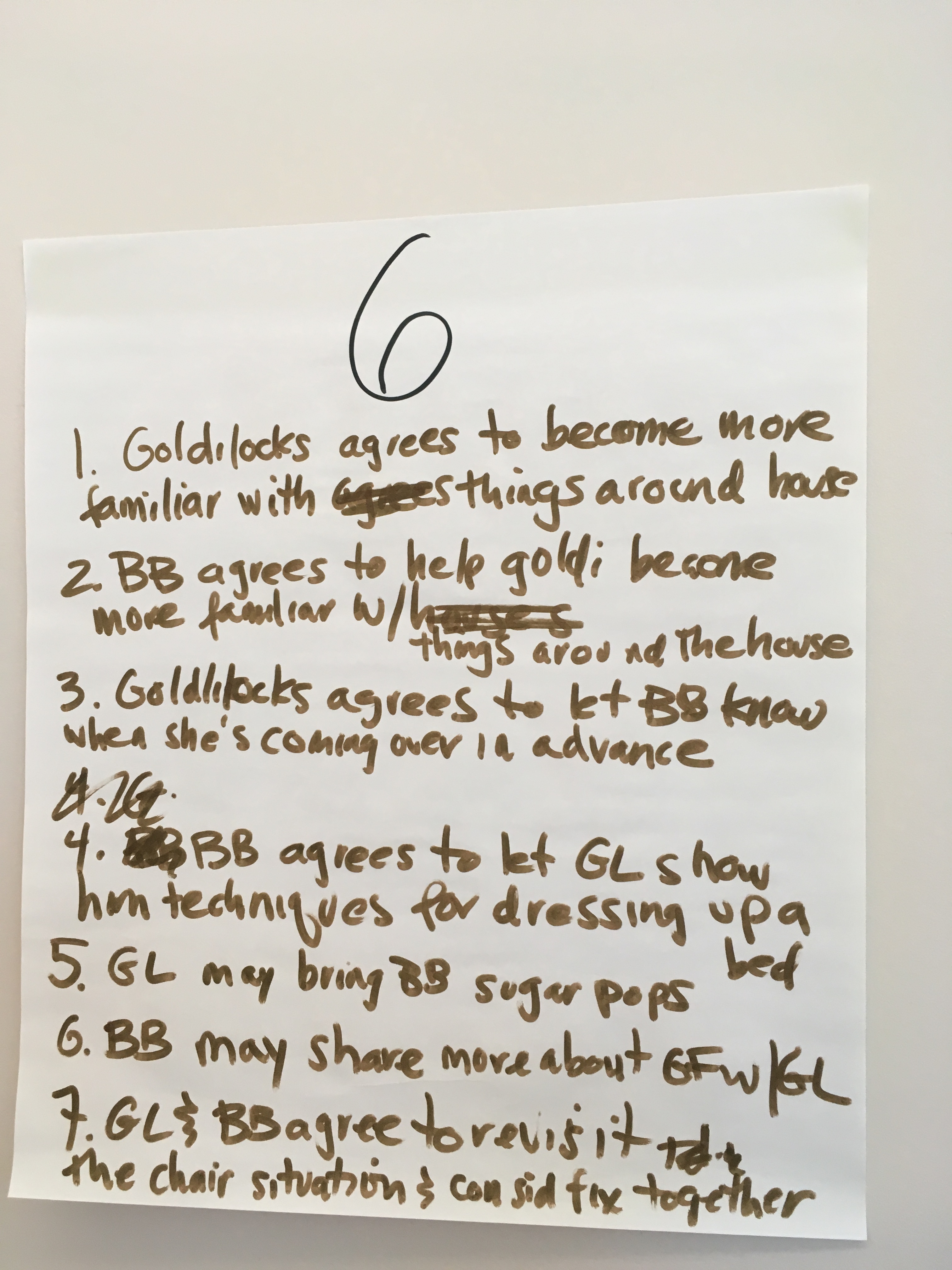 Wednesday afternoon, I was one of a group of five mediation trainess given the task of writing up the "Agreement" portion of mediation. They gave us a story -- a sort of slightly hip version of Goldilocks the housebreaker. The other character ("BB," in my shorthand here) was Baby Bear.