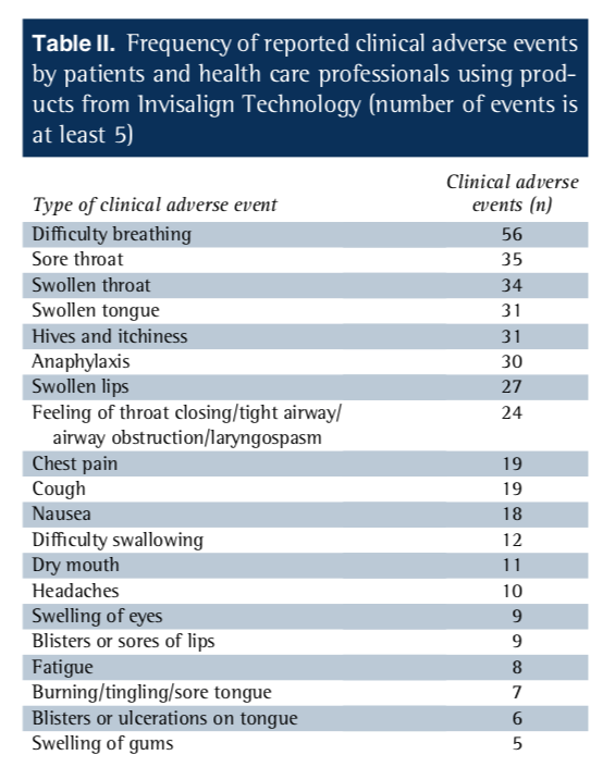 Most of those "adverse events" could easily have been psychological in nature rather than caused by the Invisalign. I know someone who I can almost guarantee would have at least a couple of those symptoms if she tried Invisalign.
