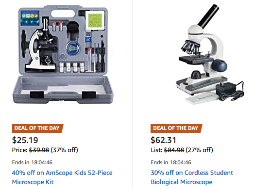 40% off on AmScope Kids 52-Piece Microscope Kit, $25.19. Also, 30% off on Cordless Student Biological Microscope, $62.31.