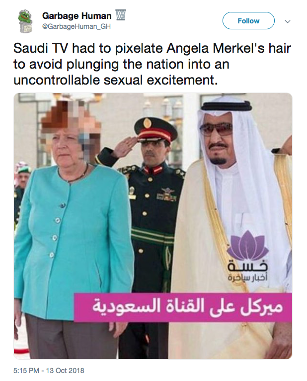 Musta been a Bad Hair Day for Merkel. FOTUSs Laura Bush, Michelle Obama and Melina Trump didn’t cover their heads. Neither did PMs Theresa May or Angela Merkel (the first time she visited Saudi Arabia). Sometimes the perm gets frizzy and the paparazzi can’t cover with a well angled shot. But, for times like this she should have taken a better photoshop editor along.
