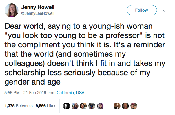 I know several male professors who look about 14, and surely get this all the time ("You don't look like a professor!") Do we think they are mewling on Twitter about this? They are not.