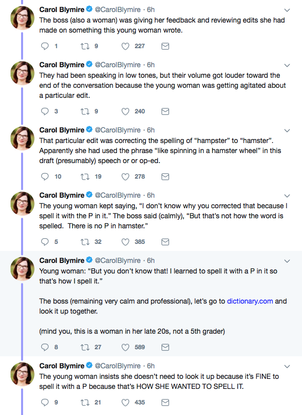 The thread goes on to mention how the young lady called her mother (on speaker) about the incident, and how the mother assured her that the boss was wrong to correct the spelling.