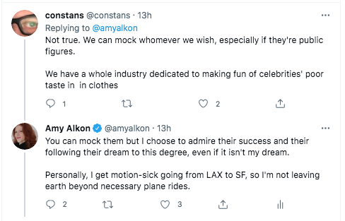 A pattern here (and social media) seems to be that if one envies a billionaire for space travel, or believes that others so envy a billionaire, the motive for the billionaire must be an off-putting demonstration of social, um, elevation.